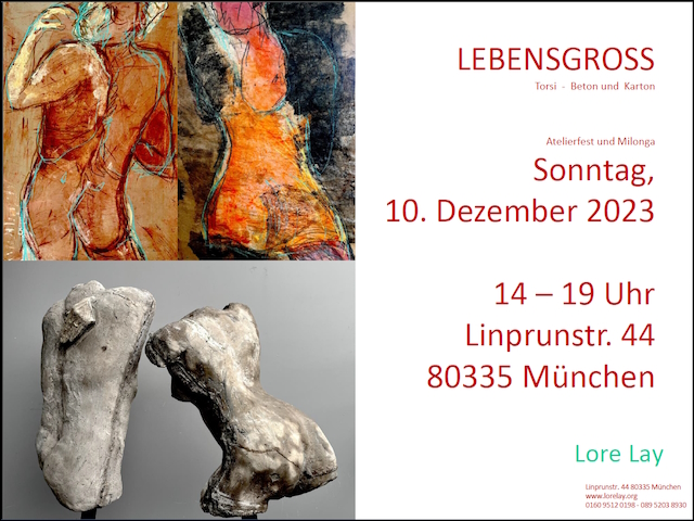 Lebensgroß Wann 10.12.2023 14:00 - 19:00 Zum Kalender hinzufügen ICS herunterladen Google Kalender iCalendar Office 365 Outlook Live Wo Atelier 3L44 Linprunstr. 44, München, Bayern, 80335 Veranstaltungstyp Atelierfest Ausstellung Milonga Torsi – Beton und Karton Atelierfest und Milonga* br> Zu sehen sind die neuesten Werke der Gattung „Torso“ in den Kategorien Skulptur und Bild. br> br> br> br> *Die Milonga ist eine Tanzgelegenheit, bei der Tango Argentino in seinen unterschiedlichen Stilen getanzt wird. Nachlese